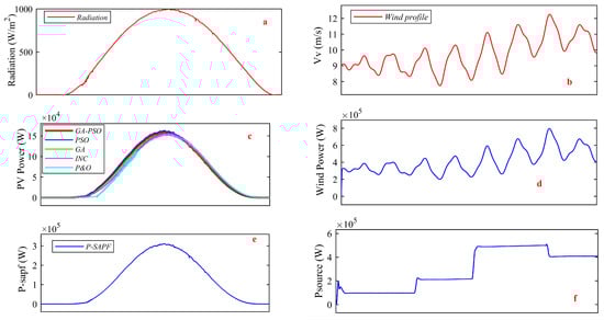- The global maximum peak (GMP) from the PV arrays is harvested by utilizing the proposed hybrid PSO-GA-LADRC technique, and the WT’s output power is maximized using the ADRC based on the optimal torque control (OTC) methodology.