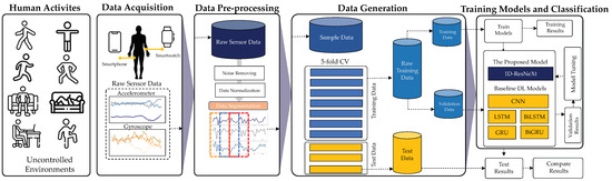 This part outlines our thorough methodology for IoT-enabled HAR in unregulated situations. Our methodology includes the complete workflow from data collection to model evaluation, as depicted in Figure 1. We started with data collection from three distinct datasets, mHealth, MotionSense, and Wild-SHARD, each illustrating various facets of real-world HAR situations. The unprocessed sensor data subsequently undergo a stringent pre-processing phase, encompassing denoising, normalization, and segmentation, to ready them for deep learning investigation. Central to our methodology is the innovative 1D-ResNeXt architecture, meticulously crafted to address the intricacies of time-series sensor data while ensuring computational effectiveness for IoT devices. We evaluate our model against multiple standard deep learning architectures, such as CNN, LSTM, Bidirectional LSTM (BiLSTM), GRU, and Bidirectional GRU (BiGRU). The training procedure leverages the Adam optimizer with meticulously calibrated parameters and leverages cross-entropy loss alongside L2 regularization. Ultimately, we assess the effectiveness of our model utilizing different indicators, including accuracy, loss, and F1-score, across all three datasets to illustrate its efficacy and generalizability in uncontrolled HAR scenarios.