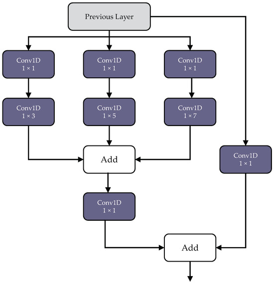The proposed 1D-ResNeXt comprises a convolutional block and multi-kernel blocks that aggregate feature maps, unlike InceptionNet [14], which merges feature maps from different kernel sizes. This approach reduces the model’s parameter count, making it more suitable for edge computing and low-latency applications. A detailed depiction of the 1D-ResNeXt model can be found in Figure 2.