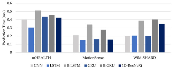 As illustrated in Figure 6, comparing prediction times across the models provides valuable insights into their computational performance. For the mHEALTH dataset, BiLSTM recorded the longest prediction time at 0.5114 ms, while LSTM achieved the fastest time at 0.3035 ms. Our proposed 1D-ResNeXt model exhibited a competitive prediction time of 0.4238 ms, positioning it within the middle range among the tested models.