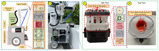 Recent advancements in the development of mosquito catchers (MCs) and fumigation techniques have been driven by the integration of machine learning, internet of things (IoT), optimized path planning, and wireless charging technologies. These innovations include fast charging solutions and reduced waiting times, supported by optimized path planning algorithms for greater efficiency. Fengjuan Tian et al. conducted a comprehensive investigation into mosquitoes and mosquito-borne viruses in Malipo and Funing counties along the Sino-Vietnam border. Their research involved the collection and isolation of 10,800 mosquitoes, identifying 29 species and 62 viral isolates across 11 categories [4]. Archana Semwal et al. presented an artificial intelligence (AI)-based mosquito surveillance and population mapping system, using the “Dragonfly” robot integrated with the you only look once (YOLO) v4 deep neural network. This system demonstrated a confidence level of 88% in detecting and classifying mosquitoes during offline tests, with an 82% confidence level in real-time field trials [5]. Mgeni M. Tambwe et al. explored alternative methods (odor lures, mosquito-electrocuting traps, and Biogents Sentinel traps) to human landing catches for evaluating the effectiveness of transfluthrin emanators against Aedes aegypti mosquitoes [6]. Meanwhile, Himanshu Sharma et al. introduced a smart agriculture monitoring system that utilized solar energy harvesting wireless sensor networks. This innovation aimed to ideally extend the network lifetime and enhance throughput for various applications [7,8]. Dingzhu Xue et al. focused on IoT-based wireless sensor networks within smart agriculture. They improved the low-energy adaptive clustering hierarchy protocol to boost node efficiency and proposed an enhanced distance vector-hop positioning algorithm [9,10,11]. Sidharth Jeyabal et al. developed a robot equipped with depth cameras, light detection and ranging (LiDAR), and inertial measurement units with advanced sensor fusion technology to accurately identify and localize the mosquito hotspots for precision fumigation to reduce chemical usage while spraying. The proposed targeted fumigation system in their study achieved 81% hotspot detection precision and observed a 62.5% increase in efficiency with reduced chemical usage [12]. The literature demonstrates the effectiveness of IoT in monitoring and managing resources in diverse applications, from agriculture to mosquito surveillance. Based on this, IoT technology is used in the current study to monitor the charge levels of MCs, enabling smart energy management and fully autonomous operation.