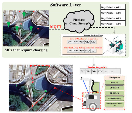 Figure 2 depicts the software architecture of the complete fumigation and charging of the MC using the Boa fumigator robot. An onboard ESP8266 microcontroller controls each MC operation. All the MCs send their vital information, like charge percentage, to the Firebase real-time cloud database using a lightweight message queuing telemetry transport (MQTT) protocol. The database keeps track of all the information on the MC and fumigation locations. The Boa fumigator robot subscribes to this information to generate a prioritized sequence order to navigate autonomously from one point to another to charge the MC and fumigation in the least possible time. All the operations on the robot side to perform navigation, fumigation, and charging of the MC are controlled using a robot operating system (ROS). As the robot is deployed in semi-outdoor and outdoor setups, simultaneous localization and mapping (SLAM) algorithms like high-definition lidar (HDL) graph slam are used to map the environment using PointCloud2 data (Shown in Figure 3b) from Velodyne 16 planes LiDAR and later localized using HDL localization for precise accuracy. The 3D map constructed is projected into a 2D plane using the octomap server to obtain a 2D map Figure 3d to facilitate the navigation using the ROS move base nav-stack.