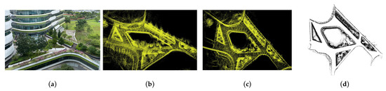 Three-dimensional reconstruction of test site using LiDAR: (a) Isometric view of test site. (b) Isometric view of the 3D map generated using PointCloud2 data. (c) Top view of the 3D LiDAR map. (d) Two-dimensional projected map from PointCloud2 data.