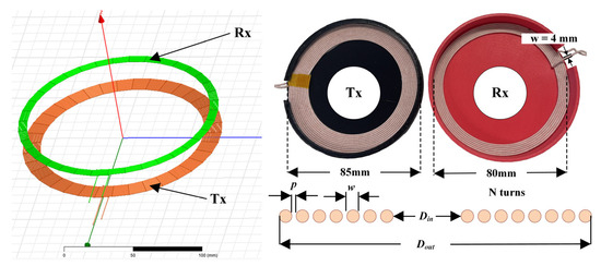 ANSYS Maxwell simulation case studies were performed to analyze the 3D magnetic field between the transmitter coil (located in the Boa fumigator robot) and the receiver coil (MC), as illustrated in Figure 5. The technical specifications of the coils used for simulation and development are listed in Table 1.