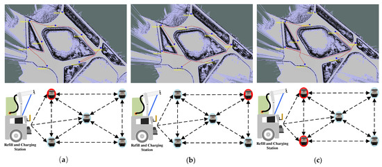 Optimized path planning also plays a critical role in autonomous navigation, which enhances the efficiency of reaching charging stations by prioritizing routes and minimizing travel time. Various path planning strategies exist for autonomous navigation, including cell decomposition, the roadmap approach, and the artificial potential field method [13,14]. Research in [15] demonstrated that Dijkstra’s algorithm is considered a benchmark solution, while constrained particle swarm optimization outperforms other meta-heuristic approaches in unknown environments. Yuanhao Li et al. introduced the predicting–scheduling–tracking charging scheme, which uses long short-term memory for node location prediction, a scheduling algorithm for target selection, and a Kalman filter-based tracking algorithm for distance control during charging [16,17]. Wenyu Ouyang et al. proposed an integrated data charging system strategy based on matroid theory, optimizing scheduling by considering the importance, deadlines, and penalty values to minimize data loss. Their approach includes a greedy algorithm that classifies tasks into early and delayed ones with a charging sequence adjustment method optimizing the mobile charger’s trajectory for efficiency [18]. Jihoon Lee et al. proposed a five-step, multi-level path planning system for indoor search and rescue operations that handles multi-goal path planning, maintains clearance conditions, and adapts to dynamic environmental changes [13]. Meiyan Zhang et al. enhanced Q-learning-based coverage path planning for mobile robots by incorporating new reward functions inspired by the predator–prey model [19,20]. Longda Gao et al. introduced a complete coverage path planning algorithm incorporating energy compensation and obstacle vectorization [21]. Anirudh Krishna Lakshmanana et al. presented a reinforcement learning-based complete coverage path planning model for the hTetro reconfigurable robot, achieving lower costs and faster path generation compared to traditional models in arbitrary environments [22]. A* serves as the foundational algorithm for all robot path planning methods and is utilized extensively in the literature above. Including a genetic algorithm (GA) with the A* algorithm in this study enhances path planning by dynamically prioritizing charging multiple MCs. This allows for real-time adjustments, optimizing travel time and distance while maintaining MC charge above 30%.
