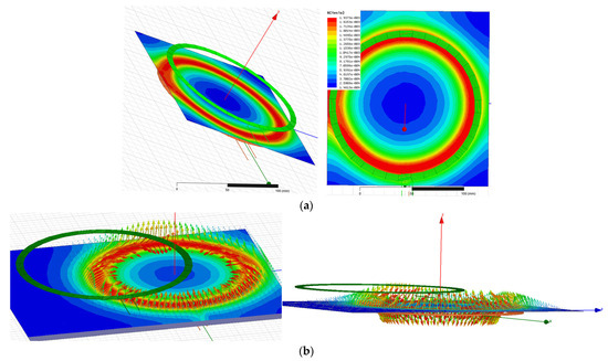 From the simulation results, as illustrated in Figure 8a, it is observed that, at the 0 mm lateral displacement between the transmitter coil and the receiver coil—i.e., both the coils are placed concentric to each other—a stronger magnetic field is generated. This alignment maximizes the flux linkage from the transmitter to the receiver coil, resulting in maximum energy/power transfer from the Boa fumigator robot to the MC. In contrast, a weaker magnetic field is produced when the transmitter and the receiver coils are placed with a lateral displacement of 20 mm, as shown in Figure 8b. This displacement reduces the flux linkage between the transmitter and receiver, significantly decreasing energy transfer efficiency to the MC.