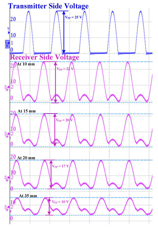 Output voltage waveform of fumigation unit and MC at various intervals of vertical displacement between transmitter and receiver coil before rectification.