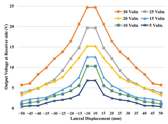 Experimental output across receiver coil at regular lateral displacements between transmitter and receiver coil with different input voltages.