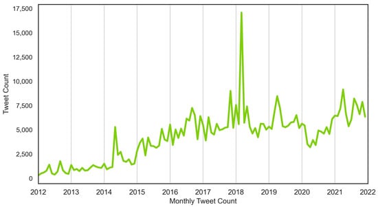 The 507,873 analyzed tweets were posted by 299,468 unique users (i.e., tweeters) and contributed to 432,467 unique conversations. The most influential tweet received 45,927 likes and 8286 retweets. Over the studied decade (2012–2021), an average of 4232 tweets were posted per month, with a monthly range of 299 to 17,090 (Figure 2).