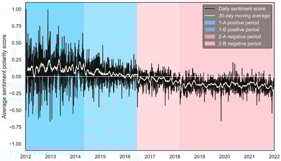 Two periods of sentiment are evident in the data: an initial positive period from 1 January 2012 to 22 June 2016, and a subsequent negative period from 23 June 2016 to 31 December 2021. Each period comprises two subperiods, labeled A and B, characterized by a decreasing average sentiment score (Figure 4).
