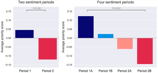 A Mann-Whitney U test indicated a statistically significant difference in sentiment polarity between the two periods (U = 24,914,037,786; p value < 0.001), and a Kruskal-Wallis H test indicated the same results for the four sentiment periods (H = 4755.07; p value < 0.001) (Figure 4).