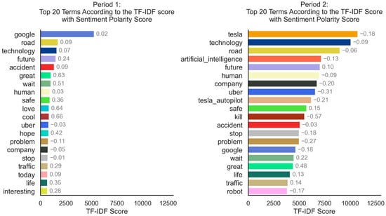 To better understand the content exchanged and discussions among tweeters, a text mining analysis of the relevant selected words was conducted. The term frequency-inverse document frequency (TF-IDF) score of the most important terms in the filtered dataset indicated that different terms were predominant in the two periods (Figure 5). ‘Google’ was more likely to be mentioned in the first period than in the second period. Conversely, ‘Tesla’ was most cited in the second period (see Supplementary Material S7 and S8). The term ‘kill’ was the first negative word in the top 20 most popular terms in the second period.
