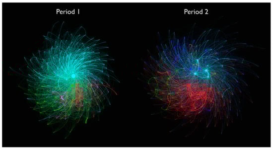 Knowledge graphs for sentiment periods (period 1: positive—2012–2016; period 2: negative—2016–2021). Visualization in Gephi using the Force Atlas 2 algorithm; the node size corresponds to the degree of weighting.