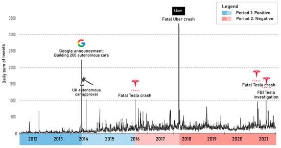 A timeline analysis of events revealed that the negative sentiment subperiods were initiated by fatal accidents involving a Tesla AV driver and a pedestrian hit by an Uber AV. The sentiment analysis revealed that these specific fatal accidents had an impact on the opinions of Twitter users. However, previous AV accidents did not have such an effect on opinion. For example, 11 minor accidents in November 2015, the first Tesla accident in China in January 2016, and a Google car hitting a bus in February 2016, received less attention. When fatal American accidents were widely covered in the mainstream media, including The Guardian [,] or The New York Times [,], a wave of negative sentiment was evident in the Twitter dataset.