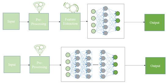 Deep learning, an evolution of machine learning, surpasses shallow neural networks by employing intricate algorithms that mirror human cognitive processes. These algorithms, forming deep neural networks, emulate the logical structure of the human brain, enabling them to draw conclusions by analyzing data. Unlike traditional machine learning, which relies on manually extracted features, deep learning operates on an end-to-end learning framework, minimizing human intervention. The architecture of deep neural networks consists of multiple interconnected layers with non-linearity, enhancing their capacity to learn complex patterns. In contrast, traditional machine learning, represented by shallow neural networks, involves step-by-step feature extraction and model construction with human-designed features. Computer vision utilizes “manual features” for precise identification within images, a process distinct from the automatic feature learning of deep neural networks. The comparison presented in Figure 2 and Figure 3 underscores the automatic nature of deep learning, driven by data and minimal user involvement, whereas traditional machine learning relies on human-crafted features and a more manual, stepwise process.