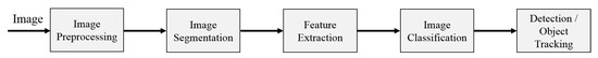 Digital image processing algorithms have been transformative in machine vision and computer vision, reshaping visual perception and enabling machines to comprehend and analyze images [10,11]. Originating from image processing, these algorithms have driven progress in pattern recognition, object detection, and image classification, ushering in a paradigm shift. Machine vision leverages intricate techniques and mathematical models, bridging the gap between human visual systems and machine intelligence. By extracting meaning from visual stimuli, computer vision has transformed our understanding of artificial intelligence’s visual realms. Images convey diverse information, including colors, shapes, and recognizable objects, analogous to how the human brain interprets emotions and states. In machine vision, algorithms analyze digital images to extract information based on user-defined criteria. Object detection, face detection, and color recognition are some examples, illustrating the system’s dependence on specific patterns for information extraction [12]. The process involves detecting patterns representing objects, with the detailed steps outlined in Figure 4.