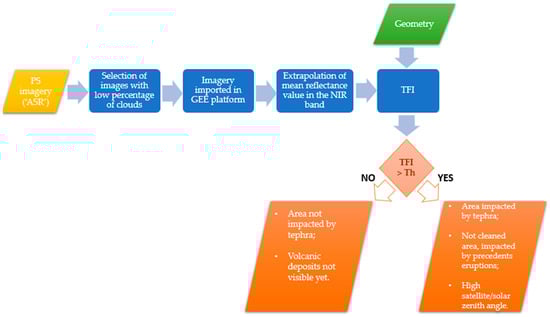 Flowchart with the main steps of the methodology: PlanetScope PS imagery (in ASR—analytic surface reflectance format) and selected geometries represent the data input; blue rectangles report the main processing steps (where GEE stands for Google Earth Engine and TFI includes the Tephra Fallout Index computation), while orange parallelograms are the possible outputs to highlight areas impacted by tephra fallout depending on the TFI values with respect to the selected threshold, Th.