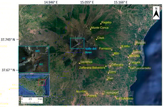 Google map of Mt. Etna, where the localization of the analyzed areas and villages located on the north-east, east, south-east, and south flanks of Mount Etna is reported. In the bottom left inset, the map of Sicily with the Etna volcano framed in red is reported, and in the top inset, there is a zoom on the Summit Craters.