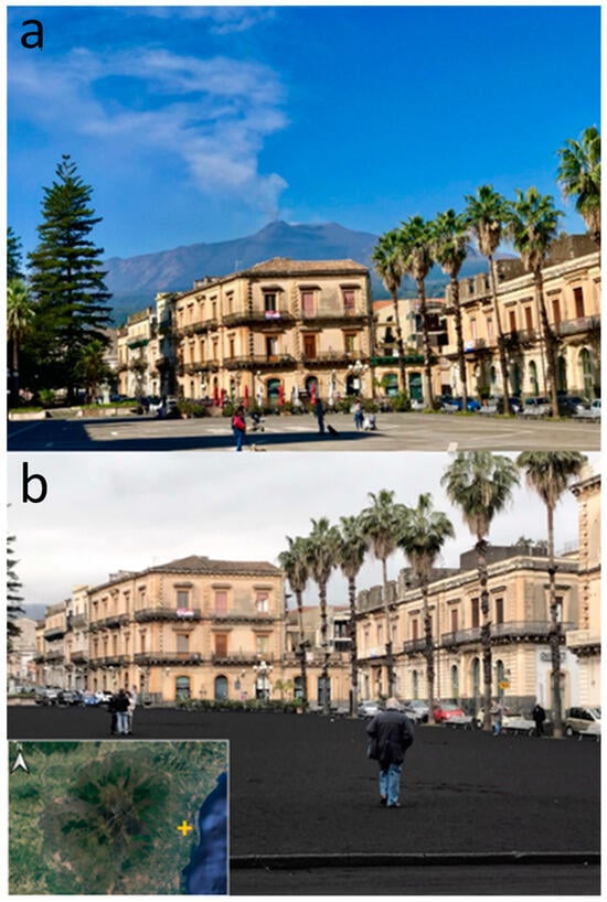 Piazza del Duomo (Giarre) before (a) and after (b) the paroxysmal event on 7 March 2021 (courtesy of T. Caggegi). On the left inset the satellite view of Mt. Etna is depicted, with Giarre highlighted in yellow.