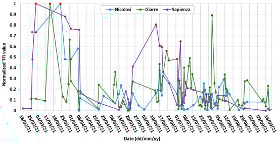 Normalized TFI values related to a square in Nicolosi (900 m2 surface area, blue dotted line), Piazza del Duomo, Giarre (2600 m2 surface area, green dotted line), and the parking area next to Rifugio Sapienza (14,250 m2 surface area, purple dotted line). The days affected by eruptive episodes are highlighted with red dots: (i) Nicolosi: 28/02/2021, 3/03/2021, 24/03/2021, 2/04/2021, 17/06/2021, 20/06/2021; (ii) Giarre: 15/03/2021, 23/06/2021, 2/07/2021, 1/08/2021; (iii) Sapienza: 3/03/2021, 2/04/2021, 14/06/2021, 17/06/2021, 5/07/2021.