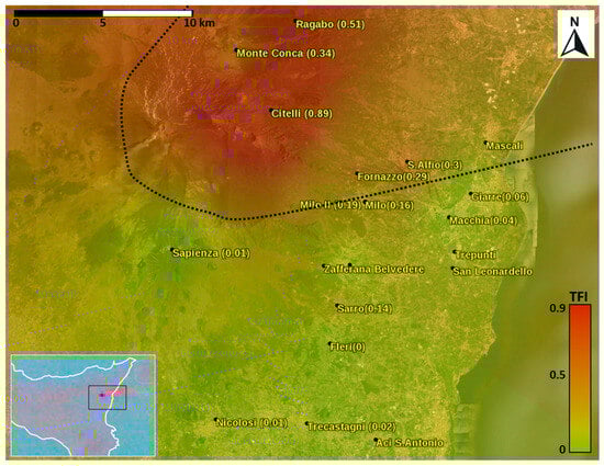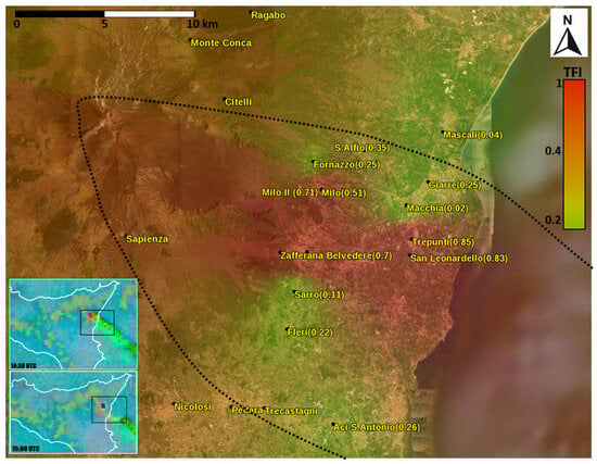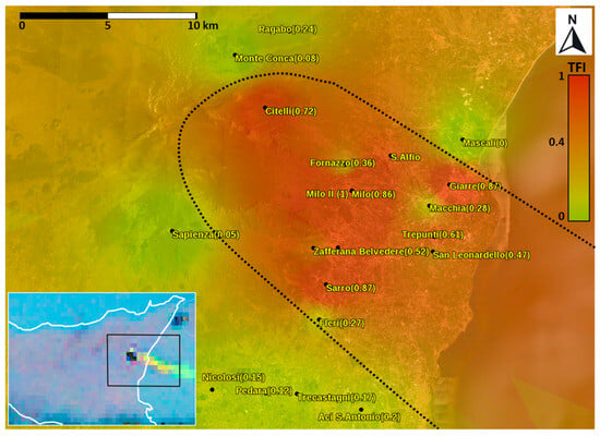 From Figure 7, it can be observed that the villages affected by the passage of the ash cloud have a higher normalized TFI value than the other areas, ranging from 0.29 (Fornazzo) to 0.89 (Citelli), whereas the other paved areas show values from 0.19 (Milo) to 0 (Fleri). In the north-east area, we therefore find the highest values, confirming the direction of the dispersion of the products emitted, as reported in the bulletin on the INGV-OE website related to that day. Among the localities affected by the passage of the volcanic cloud, Fornazzo is the one which presents a lower percentage, constituting the threshold limit value for this eruption among the areas on which the calculation could be performed.