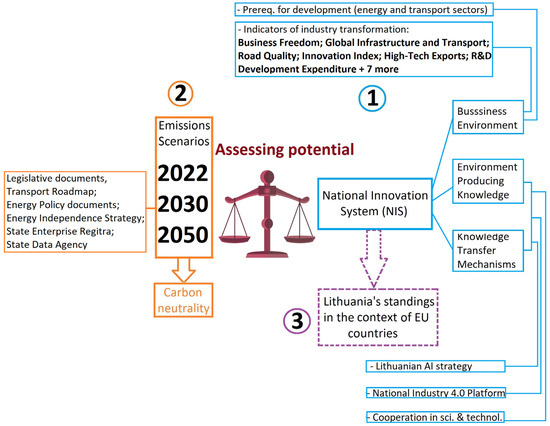 The NIS (step #1 in Figure 1) is presented as three interrelated macro blocs: the business environment, environment producing knowledge, and knowledge transfer mechanism. Based on the obtained findings and insights, we then calculate emission scenarios for passenger cars and light-duty and heavy-duty vehicles within three different time horizons: 2022, 2030, and 2050 (step #2). Compared to other case studies on decarbonization roadmaps, to give as much of a realistic picture for 2030 and 2050 scenarios as possible in terms of AV and smart infrastructure readiness, we employ the outcomes of the NIS analysis. Further on, Lithuania’s standings in the context of EU countries are briefly assessed (step #3).