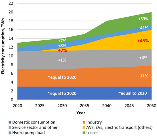 Electric energy consumption in the transport sector is expected to increase steadily until the year 2030, followed by a sharp jump by 27.6% between 2030 and 2040, and obtaining its peak of 19.81 TWh by 2050, which will exceed the 2020 levels by 45%. The second largest change in the pattern of electricity use during the 30-year period is expected to occur in the hydro pump load with a 41% higher request in 2050 than today. The short-term demand prediction for the year 2025 for the sectors remains closely equal to that of the figures in 2020; the upcoming years will face a 1% growth in industrial demand, followed by 7 to 8% higher consumption via the hydro pump load and transportation sector. There is a forecast that industry growth will experience a growth rate higher than the average until 2050 even though the expected demand for electricity in this category will increase by 11% [46]. The trend in electricity demand in Lithuania due to transport electrification between 2020 and 2050 is demonstrated in Figure 3a.