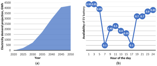 Evolution of electric mobility as a flexibility provider in Lithuania: (a) demand projection and (b) capacity profile (weekday) [46].
