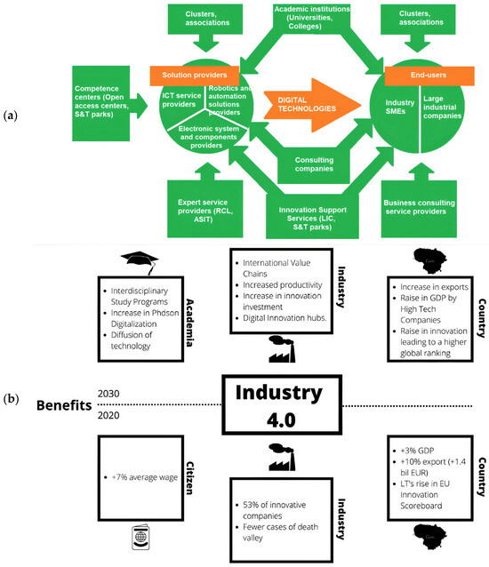The wide-scale adoption of digitalization, 3D printing, cloud computing, the Internet of Things, big data, and edge computing to obtain a viable advantage over conventional industrial techniques and processes is termed Industry 4.0 [64]. Industry 4.0 (‘Pramone 4.0’ in Lithuanian) is the Lithuanian strategic step toward the implementation of the industry–government interaction for technology, infrastructure, and digitalization. The industrial shift will beneficially affect the carbon energy transition, increase job opportunities, broaden innovation and its diffusion, broaden entrepreneurship, mobilize the private sector, and make growth inclusive. The entire ecosystem for industry digitalization and key findings of the Industry 4.0 benefits for Lithuania are summarized in Figure 4.