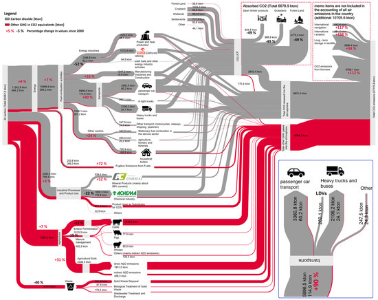 Figure 5 shows the visualization of the annual GHG emissions in Lithuania that were equal to 2026.6 kton [87]. The transportation sector with 5996.5 kton of CO2 emissions was the largest emitter among all industries, showing a 90% increase in the level since 2000. Two major emitters, passenger car transport (3360.8 kton) and heavy trucks and buses (2106.2 kton), were responsible for 81.3% of all CO2 released into the atmosphere via the transportation sector. The contribution of an ever-increasing number of light-duty vehicles and heavy-duty vehicles (LDVs, HDVs) is paramount.