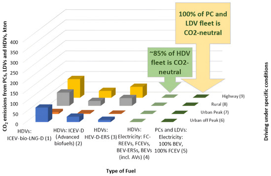 The statistical data show that approximately 440,316 personal cars belong to the countryside (60% of which participated in daily traffic) and 912.708 to a city (50% of which participated in daily traffic) in Lithuania [33]. It was assumed that rural/city traffic had specific contributions to different driving conditions: urban peak—15%/26%, urban off-peak—10%/26%, rural—50%/24%, and highway—25%/24%, respectively. The percentage of vehicles in everyday traffic was accounted for as 75% of all vehicles in each category (N1, N2, and N3) [34,35]. Specific contributions to different driving conditions for HDVs are as follows: urban peak—3% (3% for LDV), urban off-peak—20–20% (50% for LDV), rural—20–47% (47% for LDV), and highway—30–67% (0% for LDV). Therefore, as far as driving conditions are concerned, total emissions were calculated by means of the following equation [33]: