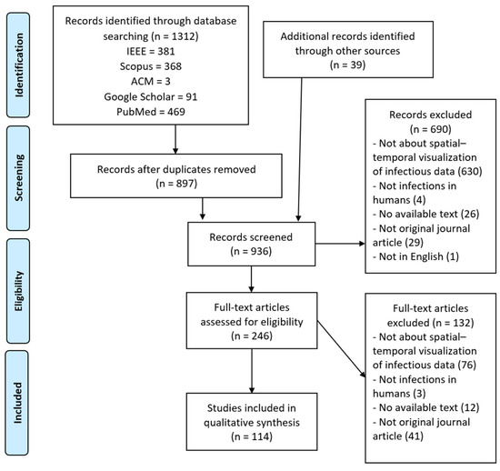 We then screened the titles and abstracts of the remaining papers. The studies were screened by two reviewers. When in doubt as to whether to include a work, a discussion took place between the four reviewers until an agreement was reached. The exclusion criteria employed were as follows: (1) papers that were not written in English; (2) studies whose approach was the modeling of epidemic data but did not make use of spatial–temporal visualization techniques; (3) studies whose target group was not people (e.g., animal or plant infections); (4) papers for which only the abstract was available; and (5) papers not categorized as original journal articles, as we consider the latter to be the most complete and reliable sources.