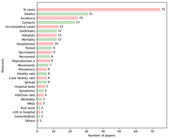 In this scoping review, we adopted “epidemic measures” as an umbrella term to include (1) key data parameters (such as the number of cases, number of deaths, symptoms, and number of medical resources), (2) the principal measures of risk indicated by the CDC [13] (morbidity, incidence, prevalence, etc.), and (3) contact and outbreak information. These pre-established statistical measures are usually applied to describe the current situation of an epidemic and predict its progression with the purpose of making decisions to alleviate it. Among all these measures, the most common ones, according to the literature [13], include the number of cases, the number of deaths, incidence, prevalence, contacts, and outbreaks.