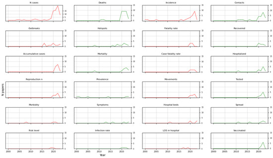We investigated the measures that were most often visually represented in the studies and found that a great number of papers graphically displayed the number of cases (75/114) and deaths (31/114). Other parameters were represented to a lesser extent, such as incidence (25/114), contacts (23/114), and accumulative cases (13/114), among others. The most repeated measures are shown in Figure 3, in which the category “Others” refers to the measures that appeared in only one study, which are connectedness between regions, the total and available capacity of a hospital, and the number of ventilators. Figure 4 shows the evolution of their use over time.