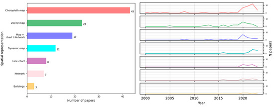 The main techniques studied are represented in Figure 5, together with the evolution of their use over time. In recent years, there has been an increasing use of choropleth maps compared to the rest, and building representations are starting to emerge in the study of epidemiological data, although the number is still low.