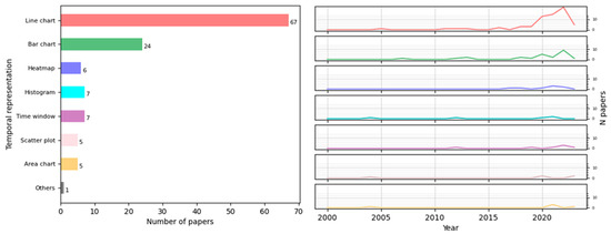 According to our review, more than half of the 114 studies (67/114) used 2D or 3D line charts as depictions of time series to represent temporal data related to a pandemic. They were not only used to depict the number of cases per week, month, or year [16,21,22,24,25,30,36,50,53,54,56,59,60,62,65,67,68,71,72,73,75,79,84,85,86,87,97,98,100,103,104,106,109,113,114,120,121,127] or cumulative cases [22,27,52,55,65,70,71,98,99,100,105,115] but were also used to depict other disease measures, such as the basic reproduction number [19,23,55,75,87,100,104,108,115], fatality rate [85,100,101,108], or incidence [32,39,57,59,62,67,97,98,104,105,120,127], among others [31,33,44,56,66,77,82,88,90,94,95,102,107,112,118,125,126]. Other papers (24/114) used bar charts based on different time granularities (days, months, and years) to illustrate the progression of the number of cases [16,28,32,41,43,48,51,63,67,68,71,90,92,96,97,104,106,120], deaths [33,68,70,96], and recovered cases [42], among others [60,88,117]. All the techniques employed to represent time in epidemiology are depicted in Figure 6, where “Others” comprises pie charts, Gantt charts, quilt plots, timelines, and specific line charts such as epidemic curves. The trends of the main techniques over the years are also depicted in Figure 6, color-coded similarly to the bar chart. It is notable that there is an increasing use of techniques such as line charts and heatmaps.
