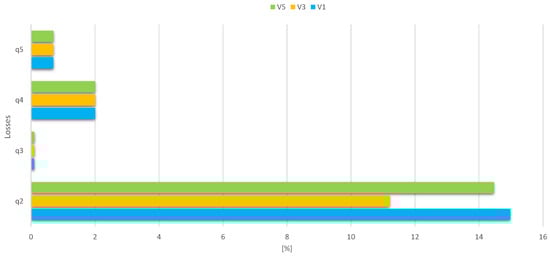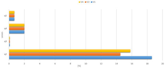 For the case studies, the percentage of chemical incombustion losses (), the percentage of mechanical incombustion losses (), and the percentage of external cooling losses () were determined according to Ref. [54]; all these losses can be seen in Figure 2 and Figure 3 where it is evident that the highest losses correspond to exhaust gas losses as indicated above.
