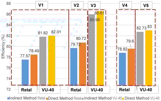 The energy efficiencies were determined for each variable depending on the technology, considering both direct method Equation (1) and indirect method Equation (3), to know the efficiencies of each of the analyzed combinations. Figure 4 shows the results obtained.