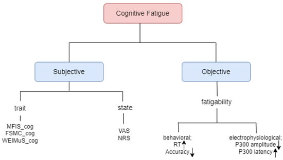 Cognitive fatigue may be assessed either subjectively or objectively [20], as illustrated in Figure 1. Subjective cognitive fatigue involves an ongoing perception of exhaustion. Objective cognitive fatigue, referred to as fatigability, is measured by the change in cognitive performance relative to a baseline [21]. Subjective fatigue can be further categorized into trait and state components. State fatigue signifies a transient condition that may evolve over time and fluctuate based on both internal and external factors, while trait fatigue characterizes a relatively stable state in an individual and is not likely to undergo significant changes over time [22].