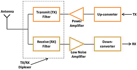 Modern wireless and computer communication technologies, such as satellites, mobile communications, and radar, heavily rely on microwave filters to ensure the required frequency selectivity. Effective signal management across diverse frequency bands is made possible by diplexers and multiplexers, which are key components in these systems. Passive multiplexers utilize multiple filters and a shared junction to combine or separate signals from different frequency bands. Over the past few years, diplexers have gained significant importance in various wireless communication systems, including mobile phone networks, satellite communication, broadband wireless communication, broadcasting, and terrestrial communication [,,,]. Diplexers accomplish this by combining two distinct filters into one unit, taking advantage of communication channels. As an example, a microwave diplexer enables two filters to utilize a single antenna while reducing interference between the signals, as illustrated in Figure 1. Through the utilization of a single antenna, this overall reduction in weight and size of the device is achieved through the consolidation of filters and signals. A great number of advancements in diplexer and multiplexer technologies have been made possible as a result of the progression of standards. To be more specific, a diplexer is utilized to transform two antennas that operate on distinct frequencies into a single port that is shared by both of them [,,,].