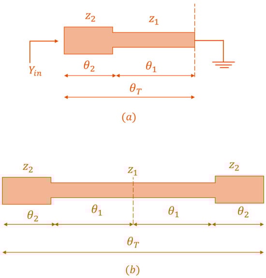 The construction of SIRs involves the utilization of a network of transmission lines that are interconnected with one another. Each transmission line is created with its specific impedance requirement. SIRs are frequently utilized in a wide variety of applications within the realm of radio frequency (RF) and microwave engineering. As a result of their diminutive size and remarkable Q-factor, they are very well-suited for use in oscillators and filters. They are incredibly beneficial for a wide variety of applications due to the extraordinary properties that they possess, which is the reason why this is the case. During the process of developing SIRs, design issues and the undesirable reactions of particular circuits were also taken into account by RF and microwave engineers. The development of SIRs was motivated by these limits. While lower SIRs can limit frequencies up to a certain point, larger UIRs are more commonly seen in RF and microwave devices. A wide range of additional uses also make use of UIRs. Figure 2 and Figure 3 display multiple examples of feasible SIR designs. There is a physical difference between the SIR and UIR lines; the former is shorter []. This holds even though UIR and SIR are based on ABCD matrices. One possible approach to express the matrix is as follows: