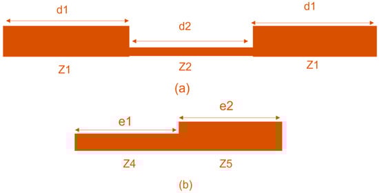 According to Figure 3, there are two distinct forms of SIRs, which are referred to as symmetric (SSIR) structures and asymmetrical (ASIR) structures, respectively. Both of these structures are referred to as SIRs. It is a well-known fact that, among the microstrip sections that are utilized in SIR structures, the microstrip segment that has a narrower width possesses a higher impedance in contrast to the microstrip section that has a wider width. It is possible to observe symmetric SIR in situations where the value of Z1 is lower than Z2, and when the value of Z4 is higher than Z5. The values of d1 and d2 are the symbols that are used to represent electrical lengths in symmetrical SIR, while e1 and e2 are used in asymmetrical SIR. A symmetrical SIR shows that the lengths are the same, which is the reason for this difference. In general, symmetrical SIR features end-to-end impedance symmetry in addition to three-step impedance sections. These sections are also characterized by their electrical length. When it comes to the symmetrical SIR, the impedance ratio acts as a replacement for the dimensions condition (K) that is associated with the SIR.