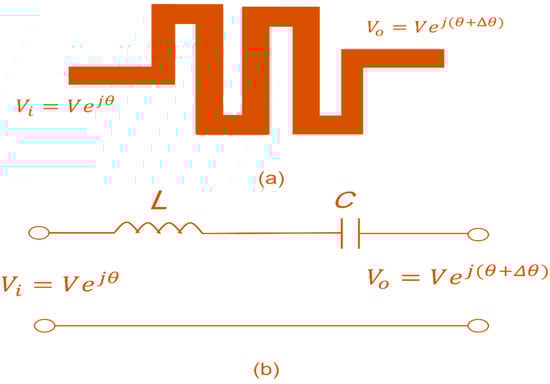 Given the information presented in Figure 6b, the impedance of the LC series can be represented using the equation j(ωL − 1/ωC). Therefore, at the terminal of the meander line resonator, the resistance load can be observed. The phase delay can be described by the following equation: