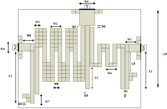 A miniature narrow-band microstrip diplexer with two channels has been perceived in [] using an FR4 substrate. Two bandpass filters, each operating in a specific frequency range, connect at a single junction to create it. The standard components of every BPF include input and output feedlines, a resonator with meandering lines, a step impedance resonator (SIR), and a uniform impedance resonator (UIR).