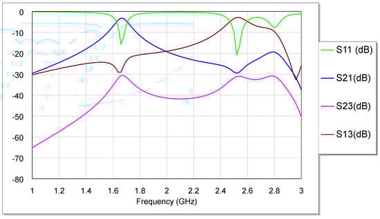 Figure 8 shows the frequency responses of the proposed microstrip diplexer. At 1.66 GHz for the first channel (Tx), the proposed diplexer design displays an insertion loss (IL) of 3.2 dB and a return loss (RL) of 16 dB. The first frequency band’s transmission channel (Tx) has a fractional bandwidth (∆F) of 4.94% and extends from 1.626 GHz to 1.708 GHz. The reception channel (Rx) for the second frequency band spans the range of 2.469 GHz to 2.598 GHz, with a central frequency of 2.52 GHz and ∆F of 5.12%. Furthermore, the insertion loss and return loss for this channel are detected to be 2.88 dB and 21 dB, respectively. Based on the results of the simulation, it has been determined that the configuration that has been proposed can maintain an isolation of 31 dB between the two filters.