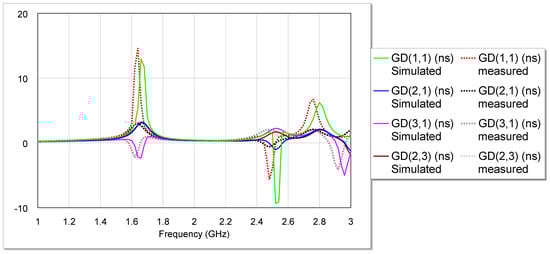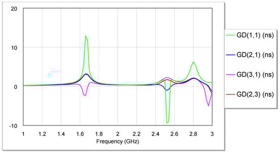 There are some operational characteristics of the diplexer that are depicted in Figure 9. A few examples of these features are the scattering parameters’ group delays (S11, S21, S31, and S32). A visual representation of these qualities can be found in the figure and Table 2. It is necessary to make use of the group delay (GD) measurement to acquire an understanding of the average filter delay over a variety of frequencies. A negative group delay indicates that the diplexer can forecast the position of the pulse at a later time by making use of the current location of the pulse rather than the position of the pulse at the time of prediction. It is possible to conclude that a negative group delay is a signal delay and is an essential property that must be taken into consideration when developing a diplexer. This conclusion can be reached following the aforementioned information. In the realm of radio frequency microwave systems, it has garnered a significant amount of attention in recent years. Below, you can find a detailed table that describes each value contributing to the group delay. Operation of a microstrip diplexer with a negative group delay requires the use of the phase of some special components like meander line resonators as a source of the required phase shift. Additionally, it clocks signals and performs such functions as signal processing, filtering, and equalization to eventually improve performance of high-tech communication systems through the reduction of latency and the gaining of greater transmission rates. A good design and appropriate tuning should be achieved in order to meet the negative group delay needs for special application function.
