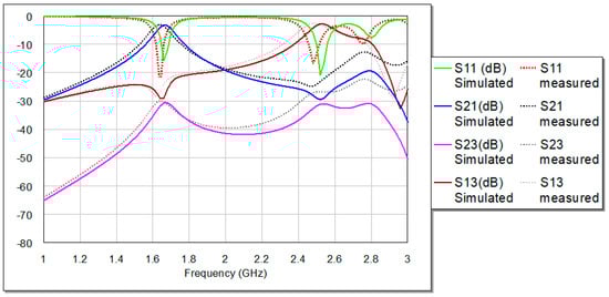 In Table 3, a comparison is made between the current study and previous studies that are associated with the relevant areas. In comparison to the findings of earlier research, the proposed diplexer demonstrates a significant band isolation level that is noticeably higher, as compared with [,,,,,,,,,,]. The proposed diplexer demonstrates competitive frequency response characteristics when compared to designs that have been published in [,,,,,,,,,,], as well as a compact size, which measures 32 × 26 mm2. In addition to this, the frequency response of the proposed structure exhibits a very good return loss in both passbands. There is a slight disadvantage associated with the device that was built, and that is its insertion loss, which is 2.88 dB for Tx and 3.2 dB for Rx. However, this is regarded to be acceptable as compared with [,,,,,,,,,,].