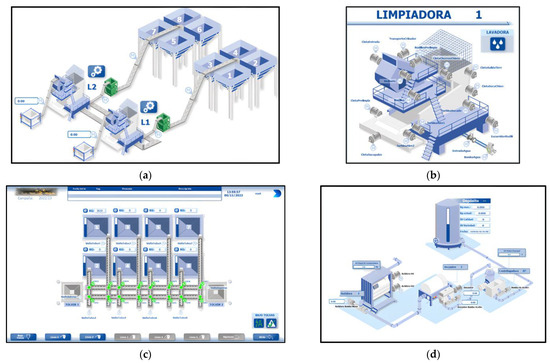 Detail of 3D SCADA screens to monitor different areas of the mill: (a) reception area; (b) cleaning area; (c) grinding area (under hoppers); (d) grinding area (grinder, mixer, decanter, and centrifuge).