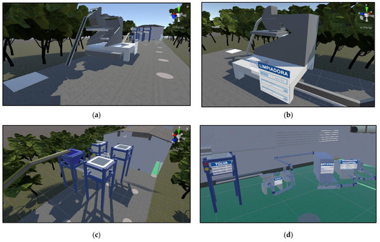 Details of the virtual environment developed for different areas of the mill: (a) reception area; (b) cleaning area; (c) grinding area (under hoppers); (d) grinding area (grinder, mixer, decanter, and centrifuge).