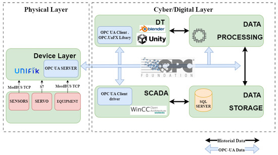 The core of the development of this research is a virtual environment that takes real-time data from physical processes using the OPC-UA protocol (see Figure 2). In the following sections, the developments carried out in the cyber/digital layer (3D SCADA and DT), as well as in the communication layer that allows the integration of the physical and virtual worlds, will be discussed in more detail.